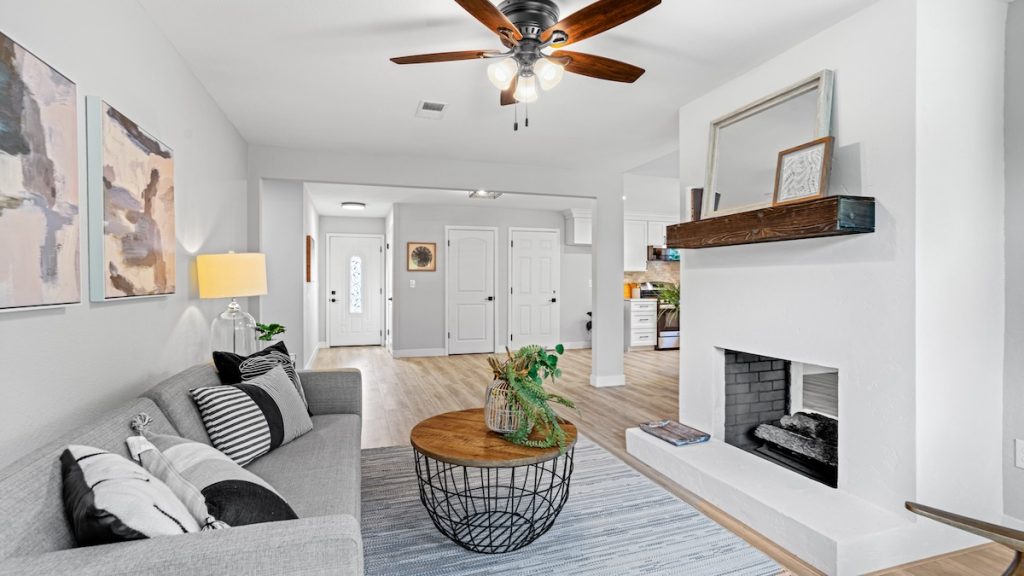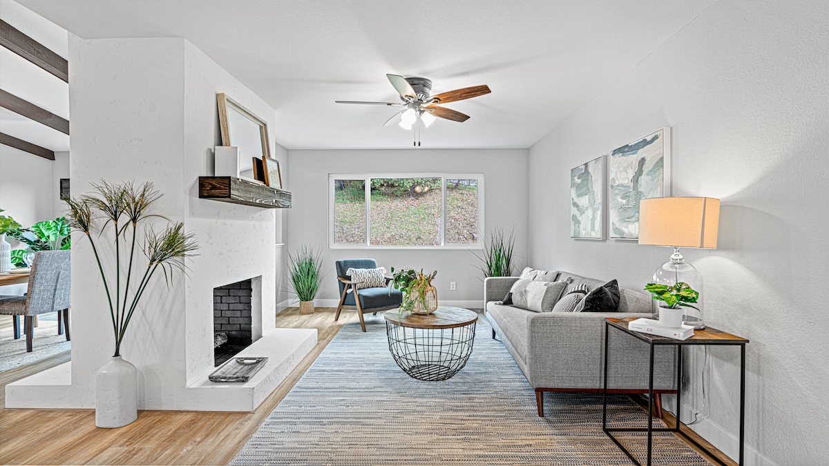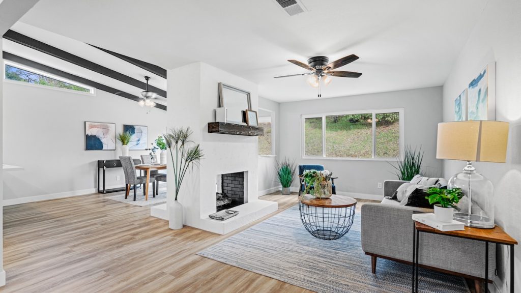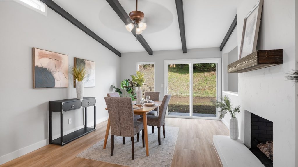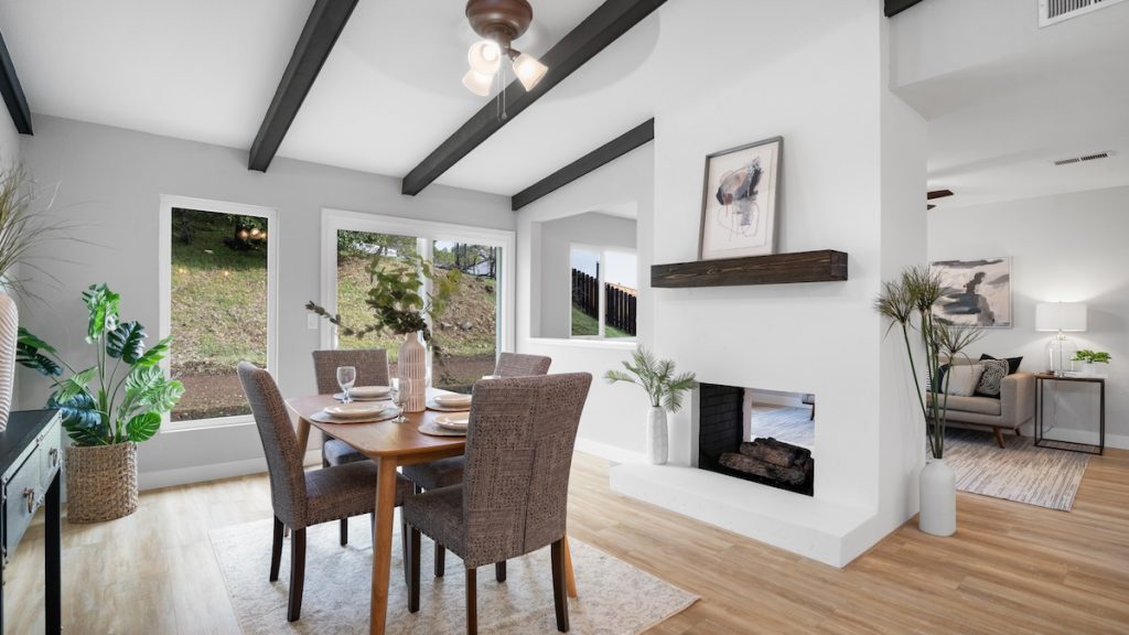 As you step inside, you’ll be captivated by the stunning open-concept design, featuring a chef’s kitchen adorned with premium finishes, gleaming countertops, and a striking wood-beamed ceiling that radiates warmth and character. The wrap-around gas fireplace serves as the heart of the home, creating a cozy ambiance and a focal point that connects both the formal dining area and the inviting family room. Natural light pours through the space, highlighting the seamless flow ideal for entertaining or relaxing after a day exploring the valley.